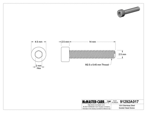 View full detailsMcMaster 91292A017 18-8 Stainless Steel Socket Head Screw M2.5 x 0.45 mm Thread, 14 mm Long 50PK