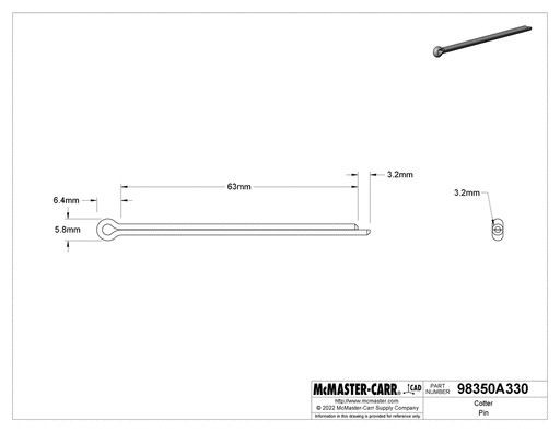 View full detailsMcMaster 98350A330 Cotter Pin Zinc-Plated Spring Steel, 3.2 mm Diameter, 63 mm Long PK25