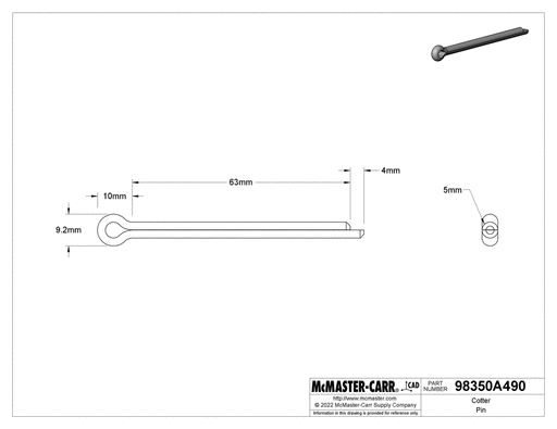 View full detailsMcMaster 98350A490 Cotter Pin Zinc-Plated Spring Steel, 5 mm Diameter, 63 mm Long