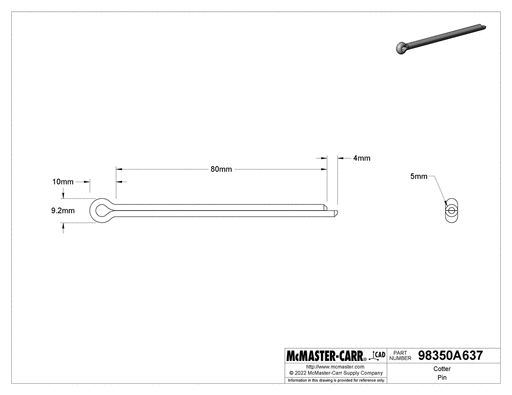 View full detailsMcMaster 98350A637 Cotter Pin Zinc-Plated Spring Steel, 5 mm Diameter, 80 mm Long
