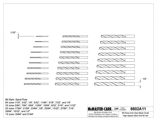 View full detailsMcMaster 8802A11 96-Piece Inch Size Black-Oxide High-Speed Steel Drill Bit Set