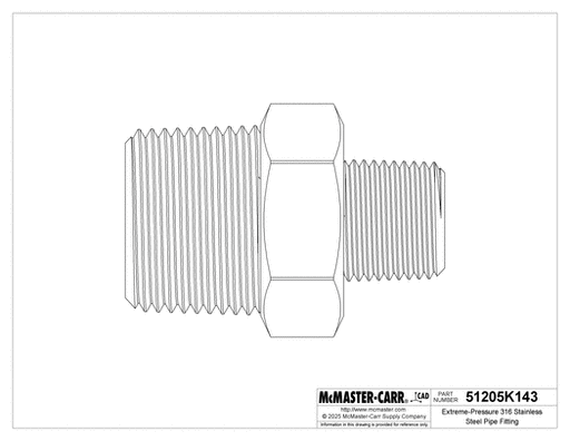 McMaster 51205K139 Extreme-Pressure 316 Stainless Steel Pipe Fitting Straight Reducer with Hex Body, 1/2 x 1/4 NPTF Male With the strength to handl...