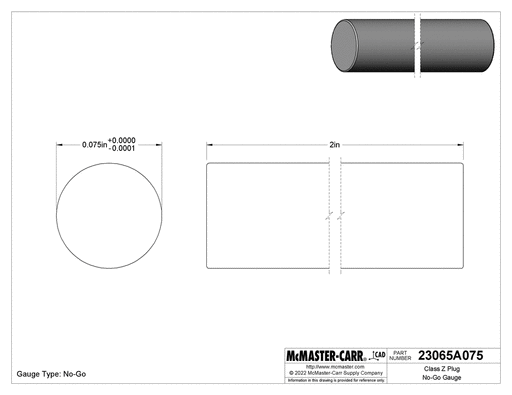 McMaster 23065A674 Plug Gauge Size 0.0750 in, Class Z Plug No-Go Gauge